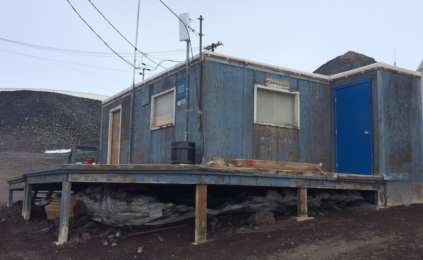 We had our first storm in quite a while -- strong winds, lots of snow, it really felt like Antarctica. And it reminded me of our laughably dire roof leak. You see, the SciCo office is just two trailers with some basic interior finish (featuring asbestos flooring!), and where they were joined together some thirty-odd years ago there remains a significant seam. This becomes apparent when several inches of snow accumulate on the roof and then melt. Peak bucket count was five, collecting at a combined rate of one gallon per hour. Dripping is a rare sound here, so we didn't mind it the first few days.